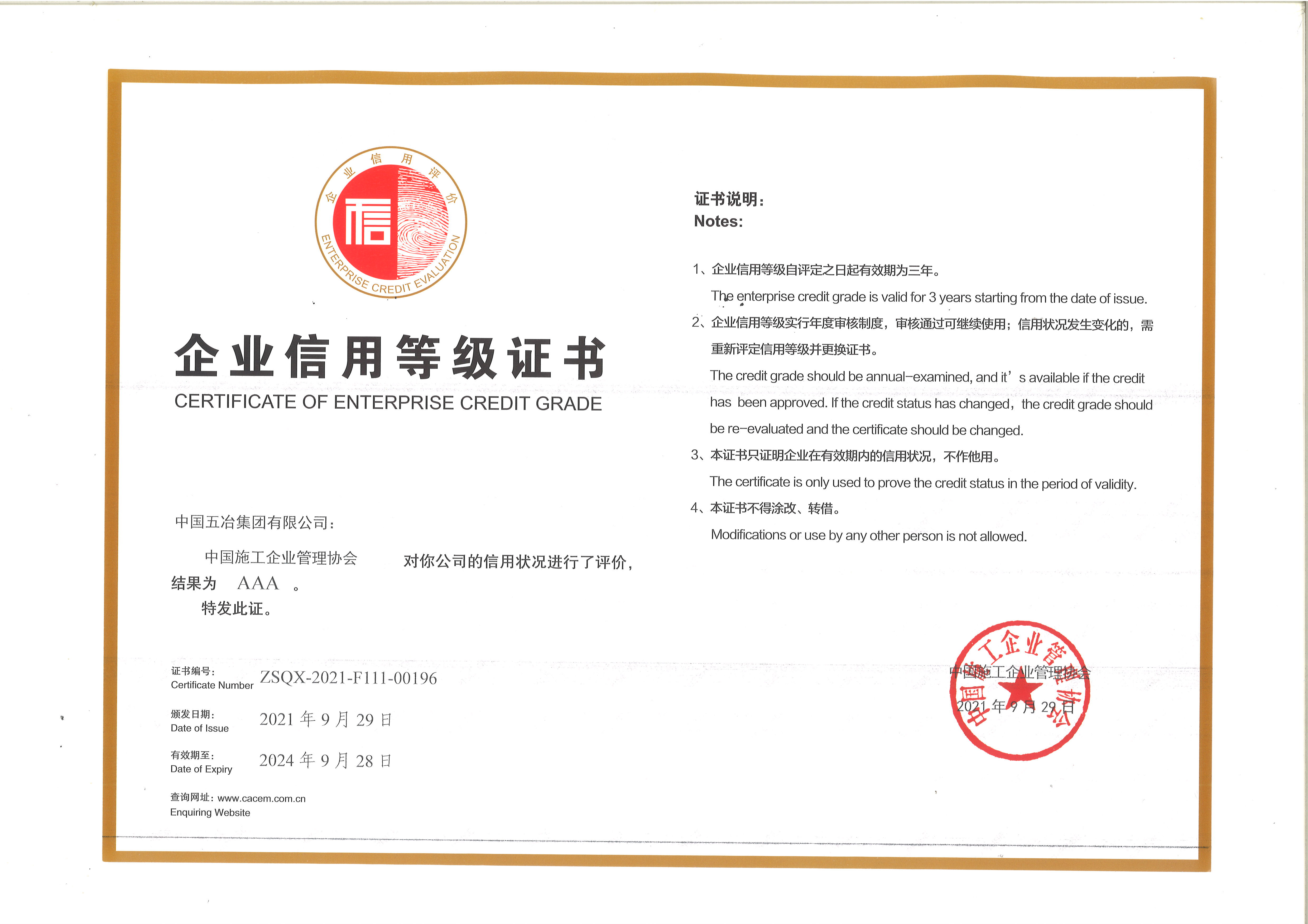企业信用等级AAA级